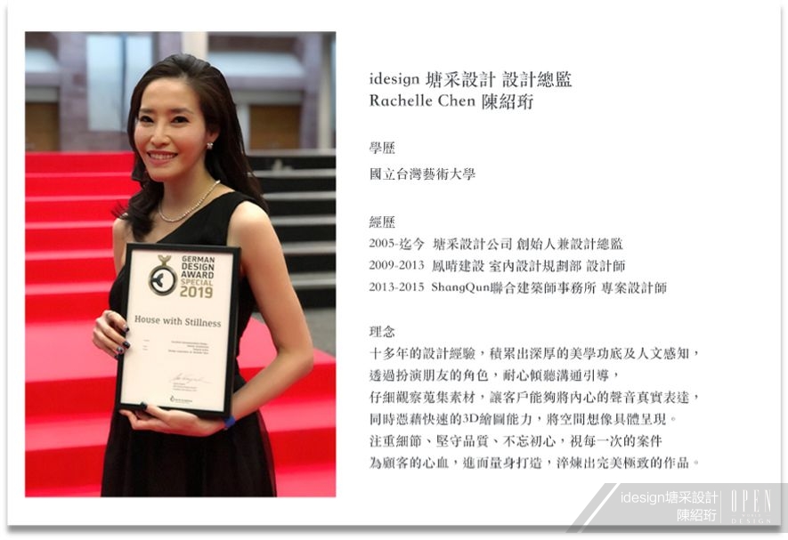 空間設計就像人生,是一道永遠的練習題,既沒有標準答案也無法單靠感覺回答;而從來不向困境低頭的 idesign 塘采設計 陳紹珩 設計總監,發揮她不服輸的心,以理性方式剖析一路上嘗過的五味經驗,再透過有意識的觀察及規律的生活習慣,將之內化為創意美學。立基於此,加上對於自我挑戰的渴望,總監讓美從細節開始實現,展現出塘采「i」的精神,從洋溢青春熱力的笑顏中,綻放出未來設計巨星的美麗形貌!