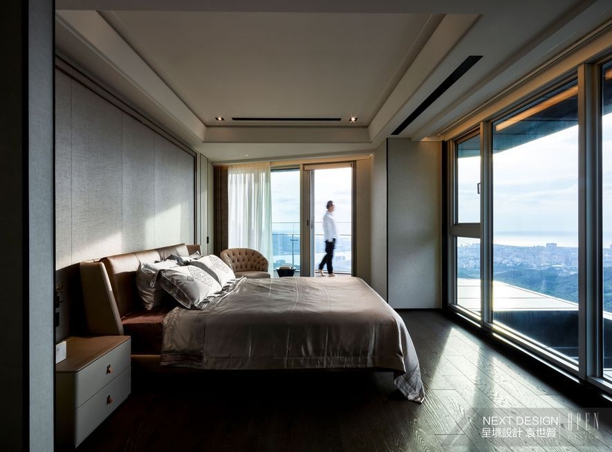 臥室同樣利用量體的制高優勢,依循屋舍體裁開擘出兩面落地窗,導引進絕大的光影奔流,沖刷出木質地坪與機能天幕的簡約質感,同時拉伸長型空間的寬敞視野,使私領域亦飽含明亮層次。臥床則呼應地板採用紅棕色系呈現,床板選用皮革包覆,與周邊單品一同強化場域的核心存在,並在壁布、單椅等溫潤物件的圍繞下,完備夢寐之間渴求的安靜時光。