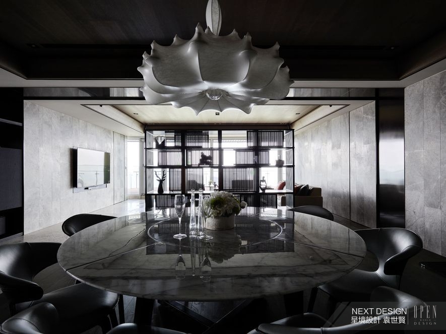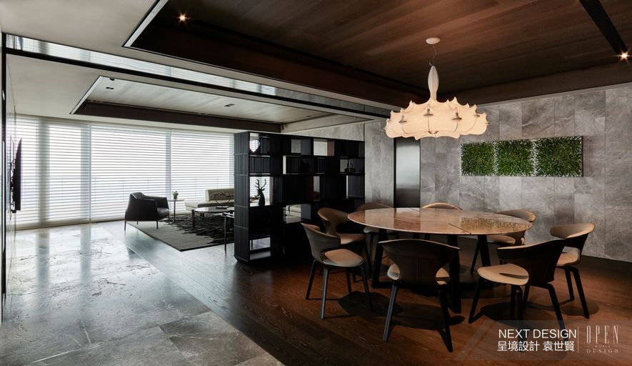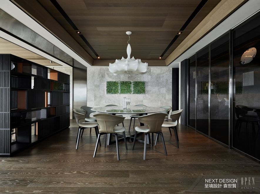 沿著動線環行而過屏風,用餐區域的木質天地開出凝白之花——垂落的造型吊燈對應圓潤綻開的潔白餐桌,有如雲彩駐足於止水,而當目光落下,牆身的植栽掛飾便趁隙而出,彷彿將遠山微觀成幾點青蔥綠意,傳達出舒心眺望的放鬆視野。此外,設計師特地保留餐區主牆的拼接線紋,既呼應兩側垂直構成的黑鏡隔間與鏤空置物架,承攬光線浸透並反照於用餐區域,亦對比地坪的水平線條,和諧地表現場所的內在關係,使人透過咀嚼慢嚥的過程,重獲一份祥和寧靜的無爭之心。