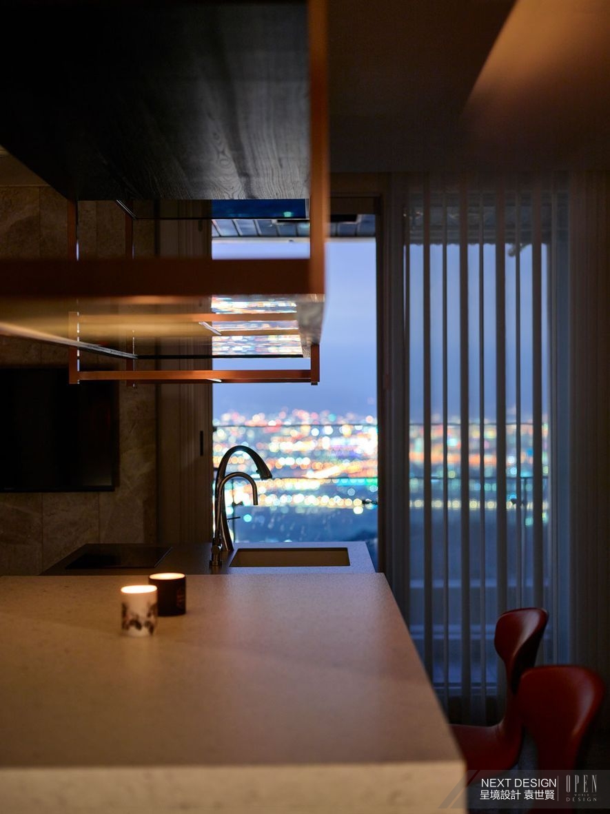 移步回到用餐區旁的輕吧台區,此處承接餐區的純白元素,轉化為簡潔中島與鏤空層架共構的輕盈視感,鐵件與石質相互晶瑩映照,使場域瞬間輕快起來;搭載造型趣味的魚尾高腳椅,其暖手的橘紅色系,一如客廳採用的色彩計畫,在細微的比例調配下,更加回應了在此吃食談天的即興需求,作為便於近察家人動態,及遠觀都市燈火的最佳景點。