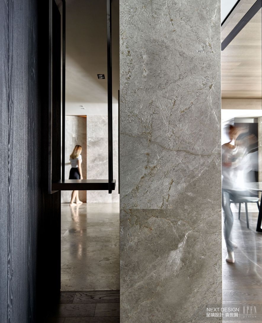 走進玄關,矗立的雲紋石屏搭佐重點式照明,首開家居沉靜而神秘的黑紗,使雙眼不禁凝視起當央掛置的巨幅畫作——畫面中一片狂風亂舞的蘆葦花群,擷取量體臨岸所見的自然意象,將當地真實的日常風景截角收藏,無形中疊合「內」與「外」的休憩想像。而開放式規劃的落塵區域,與客廳採用相同石材作為基底,悄悄破除區塊隔閡,進而達致延展空間的視覺效果,並在鮮明採光中形塑出醒目的廊道動線,引人進入下一個敘事境界。
