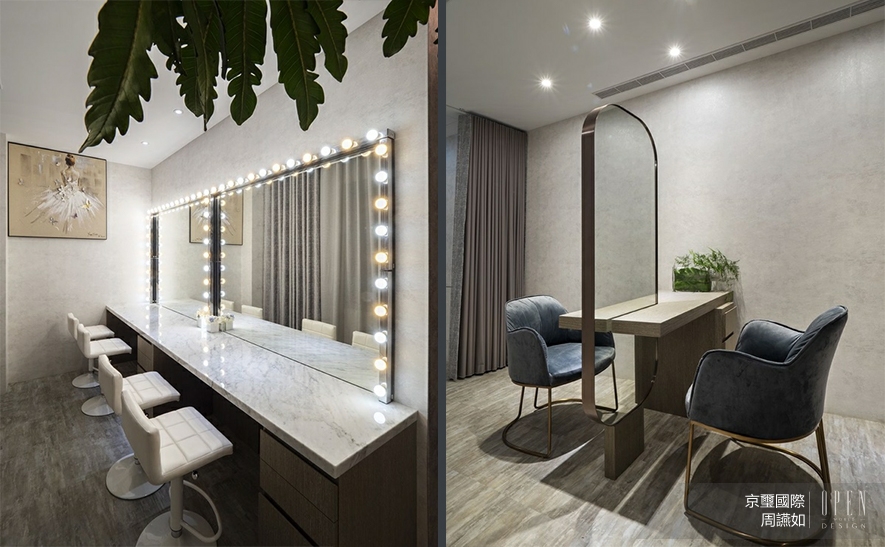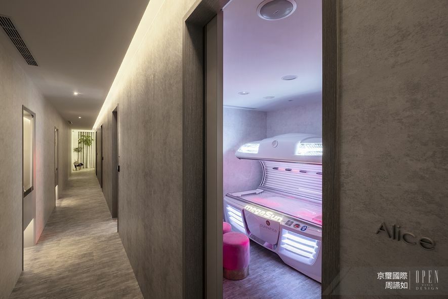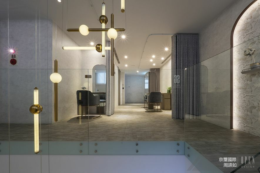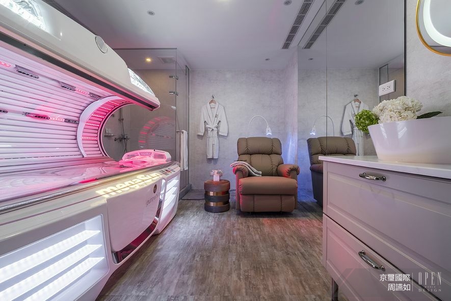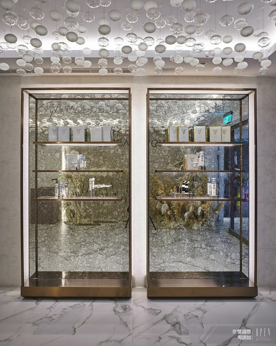 上層廊道壁面與天花板採取部分鏤空設計,絲絨般的燈光飄逸,塑造輕盈無壓的視覺感受;而沿途鑲嵌的開放式展架,則設以清玻表面,使其內精品由內而外地透亮陳列。依循人員引導,回歸個人獨立修復室,此處貼陳帶藝術紋理的壁紙以潤澤場景,再依據各別機能進行細緻風格調整;如採用古典元素與木質軟化高科技艙室的冷硬感,抑或節選復古燈鏡與拱形線條妝點摩登風情,為這座穠纖合度的量體身形,添加立體且鮮明的人物風采!