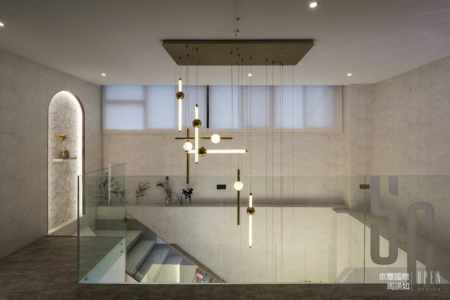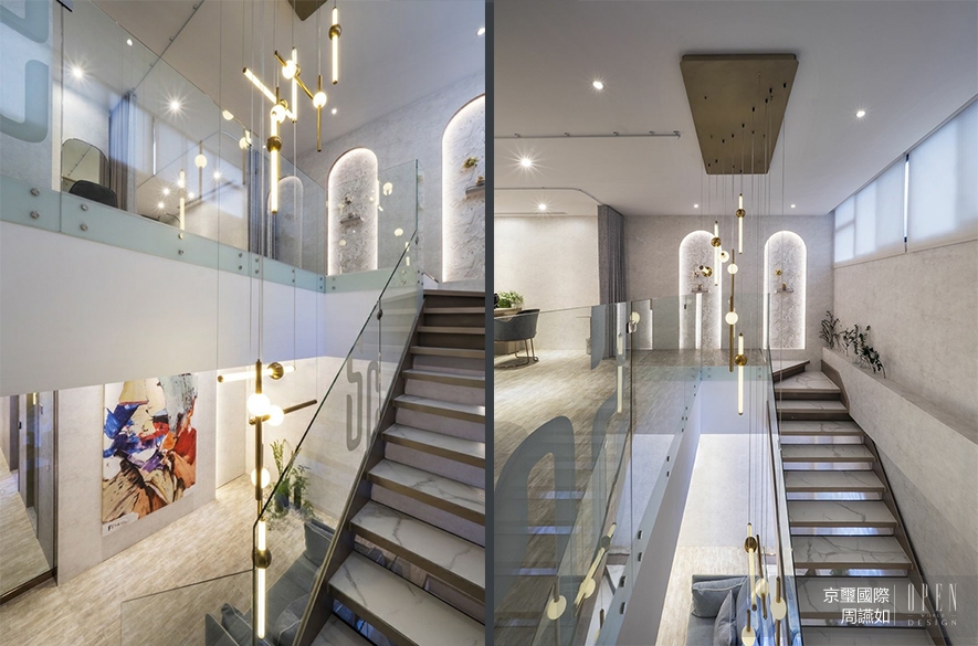 樓梯作為串連上下層的重要動線,團隊為其摒除傳統厚重觀感,改以清玻扶手、清麗石階,映襯輕和重、虛與實的美感對比。沿階攀登上層,肌膚便能自然感受到四面湧上的美感體驗——垂墜流連於樓層間的設計吊燈,回歸簡約的線面單位,連通場景而後聚攏關係,靜而不喧地雕塑出柔美主題;接著迎來有如流體畫般的端景設計,素雅泥白融混金漆,應和拱門邊緣的鍍鈦質地及當央擺設的小巧花藝,悄悄為場域穿戴上質調奢華的晶麗飾物。拾階而上,二樓廊道則沿襲入門的無暇記憶,掛搭溫煦且遮光度十足的暖灰布簾作為隔間,既為接下來即將到達的私人保養區域,保留令人安心的溫度,亦順而造就晉身美麗的通道風景。