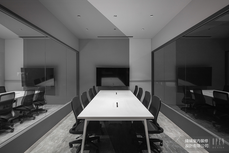 會議室的設計延續整體空間的極簡美學理念,大面積的玻璃隔間保證空間的通透性。中央純白長桌以簡約造型為基調,平滑質感創造潔淨視覺,其俐落造型亦與天花、地坪的灰白色幾何分割美學相互呼應;黑色會議椅整齊環繞,與白色桌面形成經典對比,營造專業而純淨的會議氛圍。