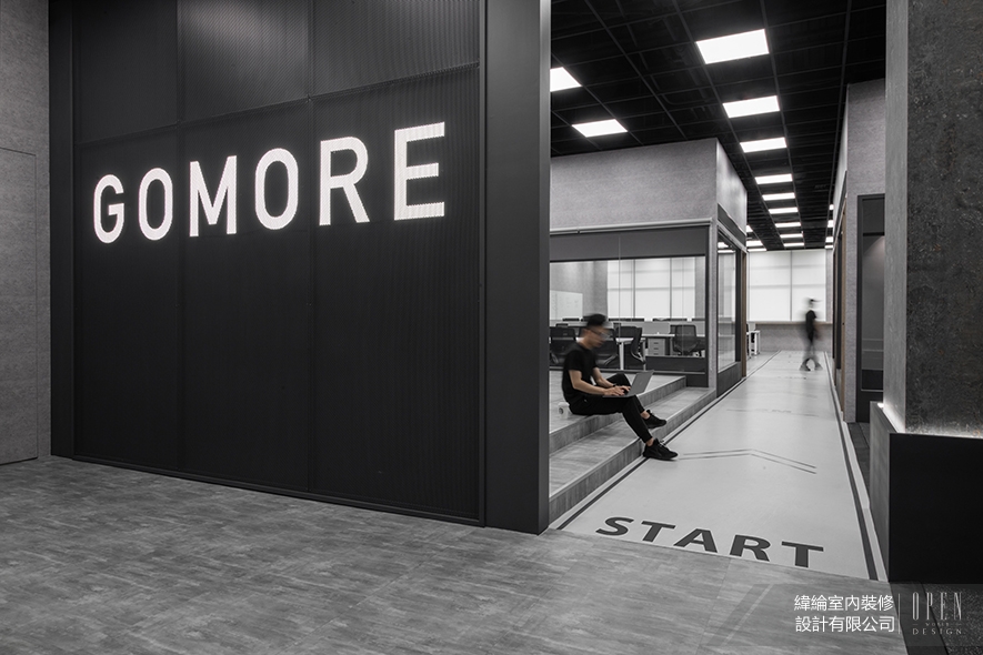 開放式工作區以深灰色牆面與地坪鋪陳沉穩基調,潔淨白色桌面搭配黑色座椅構成經典對比配置,在灰調背景中呈現俐落有序的視覺感受,奠定專注而安定的工作氛圍。因應多樣化工作情境需求,設計整合豐富協作機能:牆面大型白板成為團隊交流的核心載體,臨窗的木質檯面則提供站立討論的便利平台。地面「FINISH」標識與入口「START」遙相呼應,透過簡潔的符號定義空間的起訖,強化動線的明確性,也為嚴謹的工作環境增添一絲輕鬆的設計巧思。