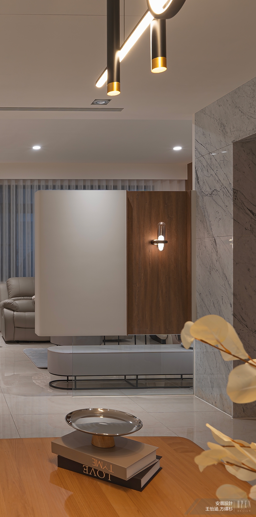 大面積的象牙白與淺駝色在此舒柔交匯,圓潤飽滿L型沙發如雲朵輕盈佔據視覺焦點,編織抱枕、毛絨織品層疊其上,為純淨基調注入溫暖觸感;前方淺色圓形造型茶几、弧形電視櫃,結合黑色鐵件框架,在懸空皓白的電視牆下帶出視覺重心,達成色彩的和諧,醞釀一室柔軟安定;一旁,大面石紋磁吸板的細膩灰白紋理,宛如行雲流水一般悠然延展,將典雅氣韻凝結於牆面,同旁側木質懸浮層板、立面構成異材質的優雅對話,在造型壁燈的光澤映照下,譜寫當代簡約與生活溫度兼容的溫馨居家時光。