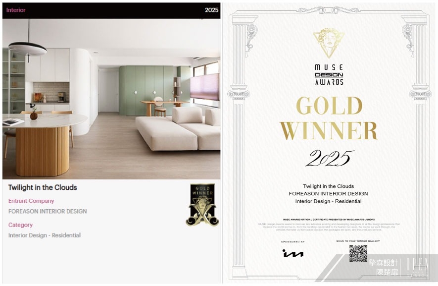 美國 MUSE Design Awards致力於發掘全球設計繆思,涵蓋建築、室內、時尚等領域。2025年共吸引來自122國、超過十萬件作品參賽,由200多位專業評審嚴格遴選,為國際設計界的重要指標。擎森設計 設計總監 陳楚扉 呼應住者對溫馨居所的嚮往,透過圓弧曲線消弭空間結構的量體沉重感,搭配大地色系與素雅淨白,營造雲朵飄浮般的輕盈詩意,家宅《雲暮》以其跳脫傳統格局、將生活哲學與空間美學完美融合的創新手法,充分體現該獎項推崇的「發掘兼具創新精神與人文關懷的設計」精神,榮獲本屆賽事「金獎」殊榮!