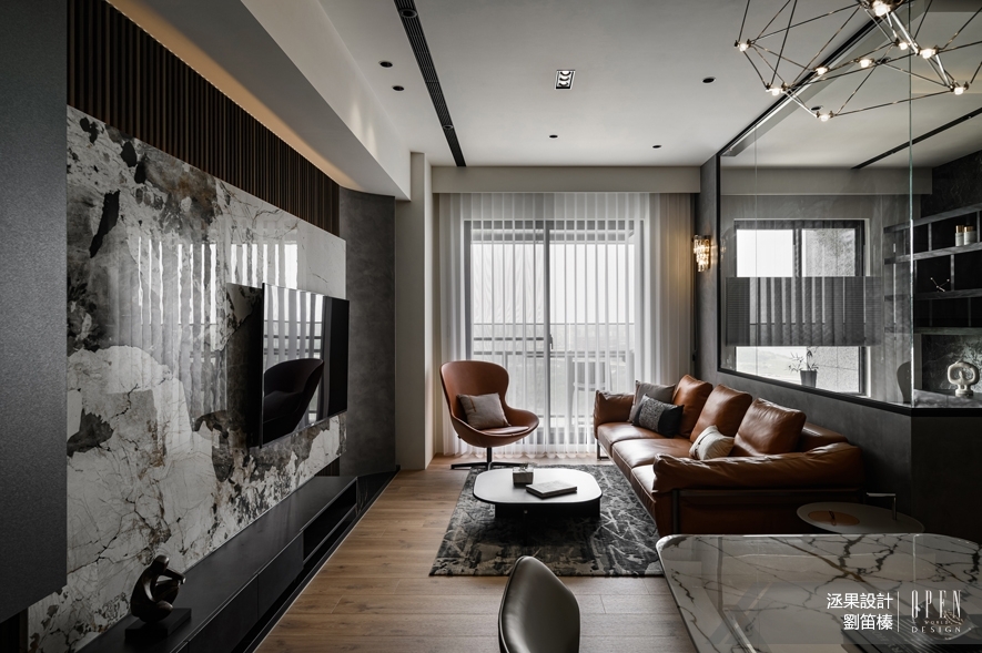 ▲客廳採黑白大板磚與木格柵雙層電視牆,前後材質拼接展現冷冽與柔潤的對比美學;圓弧窗畔設計則柔化立柱,增添空間流動感與趣味。