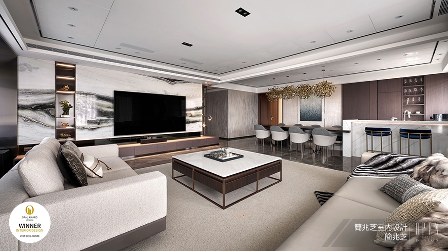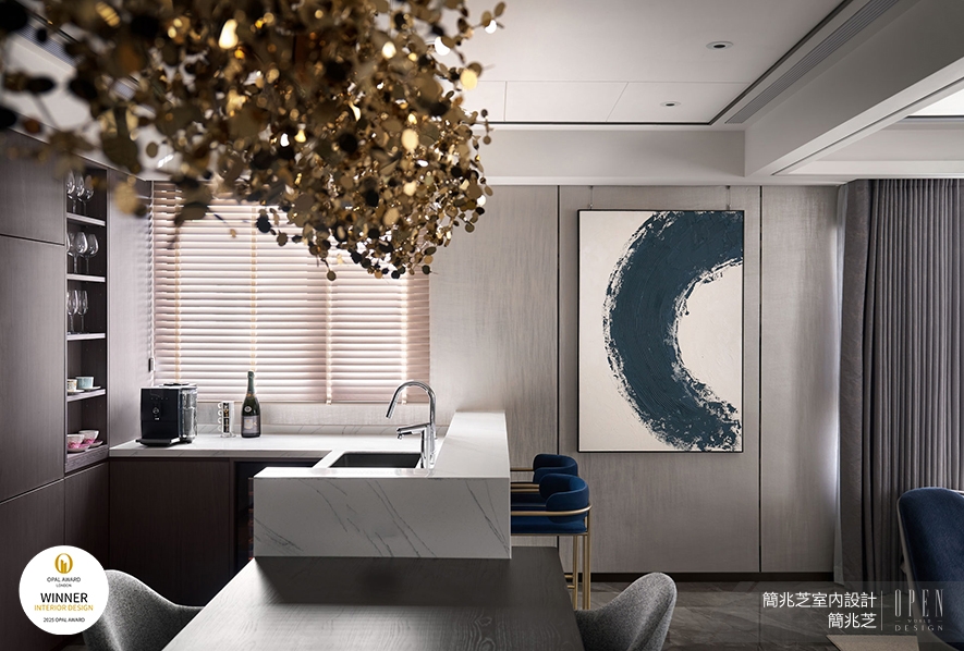OUTSTANDING PROPERTY AWARD LONDON,OPAL(英國倫敦傑出地產大獎)由全球知名企業集團Farmani Group組織,並以招攬全球最佳建築師、室內設計師與房地產開發商為目標,在創造異業菁英聯合平臺的同時,找尋各地最富創造力、革新感、社會影響力與永續性的設計方案。在本屆2025年度賽事中,簡兆芝室內設計 主持設計師 簡兆芝 選擇以住宅《璞玉天成》參與角逐,作品中運用兩戶合併的空間優勢,以灰色基調搭配鍍鈦金屬元素,結合溫潤木質與米白大理石,在繁華都市中築起一片靜謐桃源;其公領域以圓形、半圓形吊燈象徵「圓滿」,回應一家四口對情感交流的渴望;私領域則依據家庭成員個性,透過紋理壁紙與絲絨窗簾,打造專屬於每位居者的精緻場景,成功呼應大賽「找尋創造力、革新感」的宗旨,榮獲「Winner」佳績!