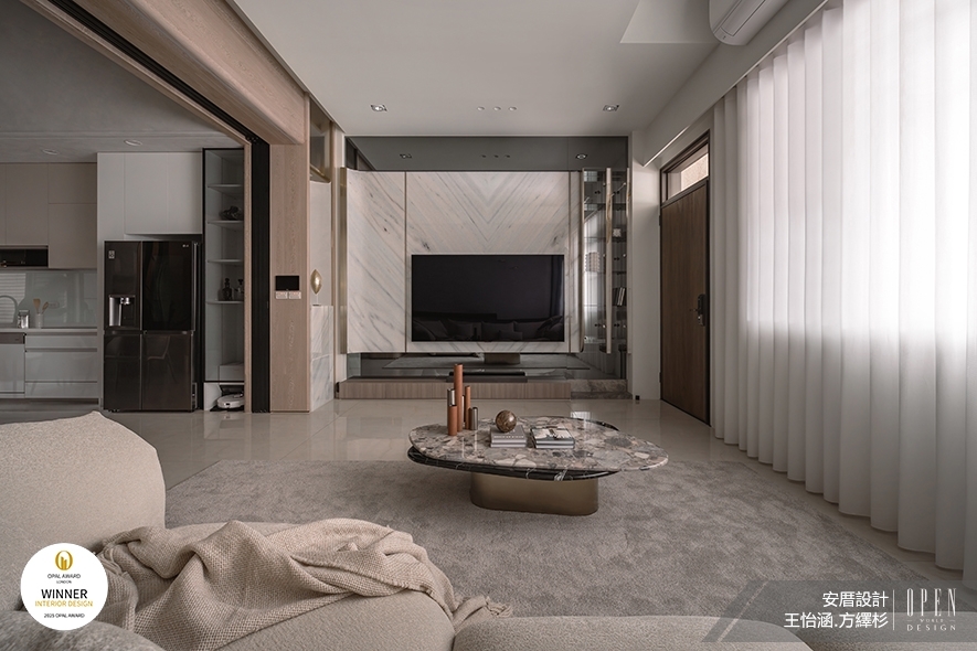 OUTSTANDING PROPERTY AWARD LONDON,OPAL(英國倫敦傑出地產大獎)由全球知名企業集團Farmani Group組織,並以招攬全球最佳建築師、室內設計師與房地產開發商為目標,在創造異業菁英聯合平臺的同時,找尋各地最富創造力、革新感、社會影響力與永續性的設計方案。本屆2025年賽事,安厝設計 主持設計師 王怡涵、設計師 方繹杉 融合華人文化、生活機能以及隱奢美學,於家宅作品《曙燁光宸》中,運用風水概念「背山面海」的吉祥意涵,沙發背牆以藝術塗料及吊燈光影勾勒綿延山勢意象,提供業主心靈層面的依靠感;對側電視牆則拼接海洋般色彩的藍、綠、白玉石,創造開闊放鬆觀感。處處蘊藏祝福寓意的優美生活端景,其富饒深厚新意的設計巧思備受評審團好評,一舉抱回此次「Winner」大獎!