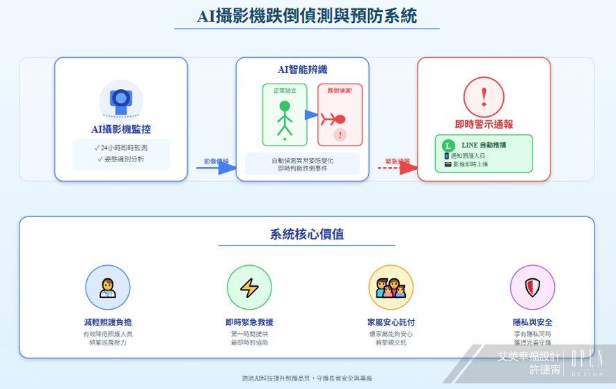 對於老年人的照護領域,總監亦是絲毫不馬虎。她特別重視跌倒預防,經由AI影像跌倒偵測的採用,監控系統可從姿態自動辨識異常情況,如當系統偵測長者從站立突然變為倒臥時,便會立即發送LINE警示,並同步將影像上傳至監控平臺。這項技術的核心價值,不僅有效減輕照護人員的巡房負擔,更重要的是能在意外發生的第一時間提供長者最即時的協助。這不但讓家屬能夠安心將摯親交託,也使長者在享有隱私的同時,獲得完善的安全守護。