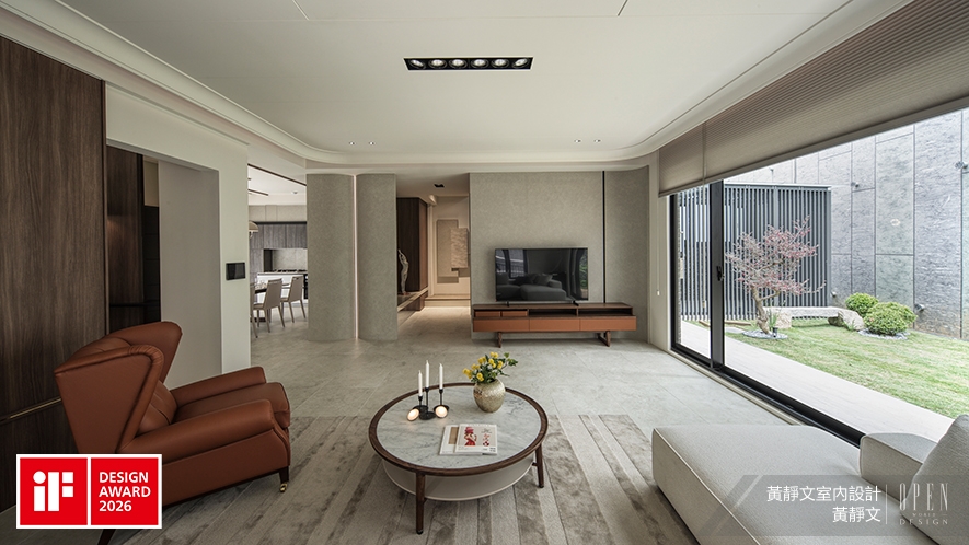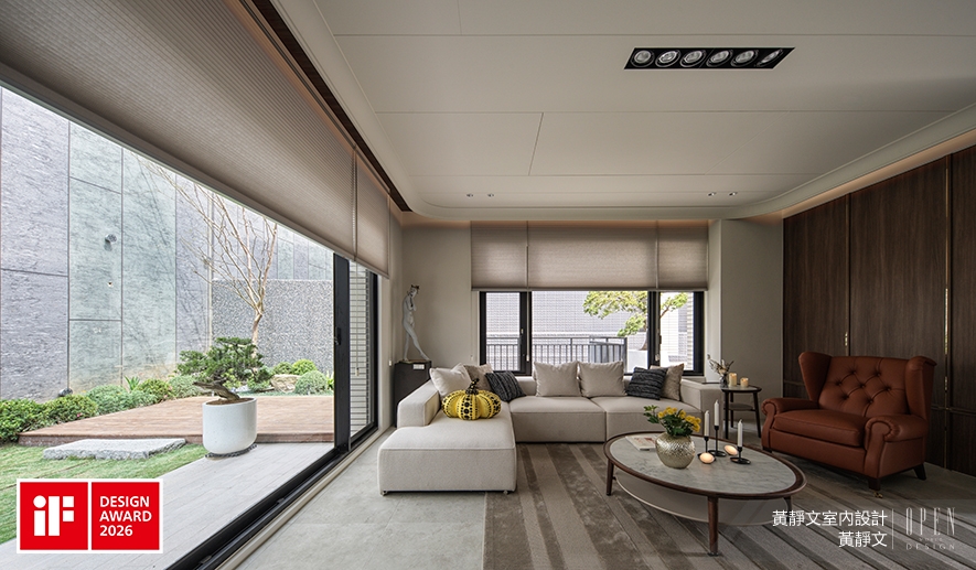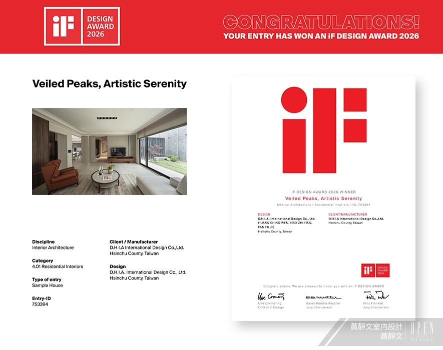 世界四大設計獎之一的德國 iF 設計大獎(iF DESIGN AWARD),自1954年創辦至今,已在國際間擁有無可取代的指標性及前瞻性。2026年 iF 設計大獎由21個國家、129位設計界權威組成評審團,依據理念、外觀、功能、差異化與影響力等五項指標,自68國、逾一萬件參賽作品中,評選出最優良的設計之作。為詮釋人與自然共融的居住理想,D.H.I.A黃靜文室內設計 設計總監 黃靜文 於實品屋《山嵐藝境》中,以大板磚山石紋理搭配手感塗料,層疊鋪陳內斂低奢的空間質感,並透過大面落地窗將庭園綠意引入室內,實現「家中多一座花園」的詩意生活。全案兼融自然美學、空間秩序與永續建材理念,完美契合賽事對「創新、機能與永續設計」的嚴格標準、順利脫穎而出,榮獲本屆賽事「Winner」殊榮!