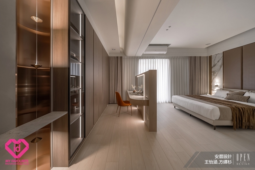 ▲主臥入門處,大面積的鍍鈦古銅色弧形牆與隱藏光源交織,如飯店廊道般低調華麗;衣帽間衣櫃以灰玻門片搭配霧面五金,在天花板環繞的弧形光影流轉間,盡展靈動優雅。