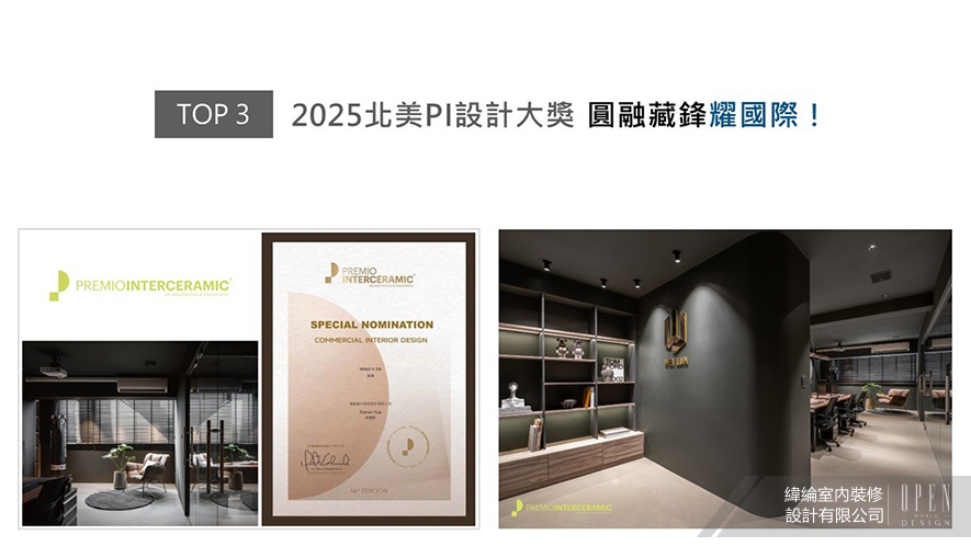 北美PI設計大獎於2012年創立,旨在表彰於建築與室內設計項目中,體現最佳原創性、格局、空間結構、協調性和概念的作品,促進建築與室內設計的發展。華總監以自用辦公室《墨隱》參與2025年度競賽,該案於窗邊特別劃設閱讀角落與休憩設施,為工作環境注入平衡張力的人文關懷,呼應大賽訴求的空間協調性,於「室內設計.商業」類別獲「Special Nominations」殊榮!