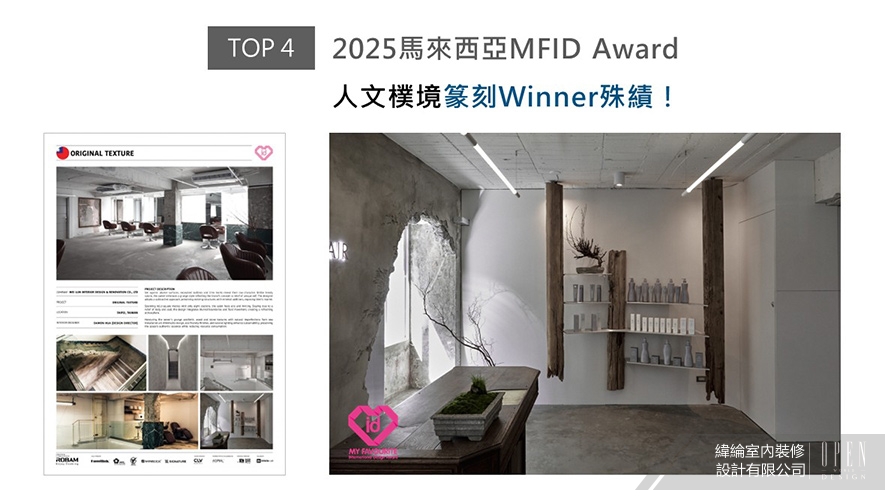 緯綸設計團隊呼應商空「釋放獨特自我」的品牌理念,採用減法設計精簡空間裝潢,並敲鑿原始建築的部分結構,形塑紀錄時光流逝般的質樸肌理,瀰漫頹廢藝術獨到美感的髮廊《Original Texture》,抱回2025 MFID商業空間類「Winner」大獎!