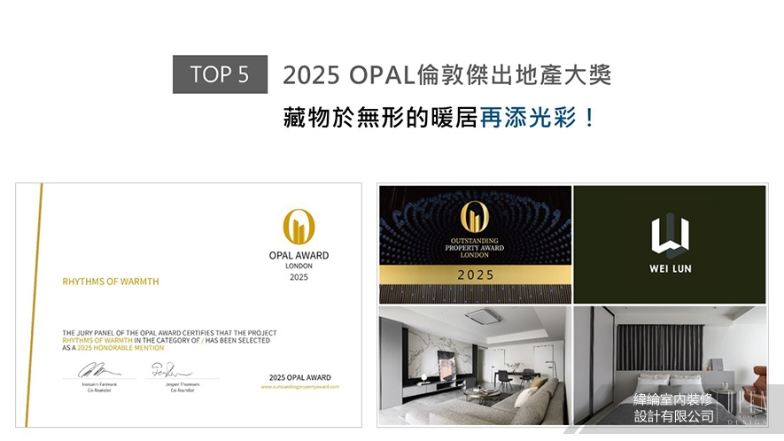 OPAL由Farmani Group組織,以招攬全球最佳建築師、室內設計師與房地產開發商為目標,找尋各地最富創造力、革新感、社會影響力與永續性的設計方案。緯綸團隊依循三代同堂的多樣需求,於家宅《暖序》中導入SPC石塑地板,輔搭低揮發性綠建材塗料,兼顧孩童活動安全與長輩健康,無毒環保的優良住宅設計,喜摘本屆賽事「Honorable Mention」佳績!