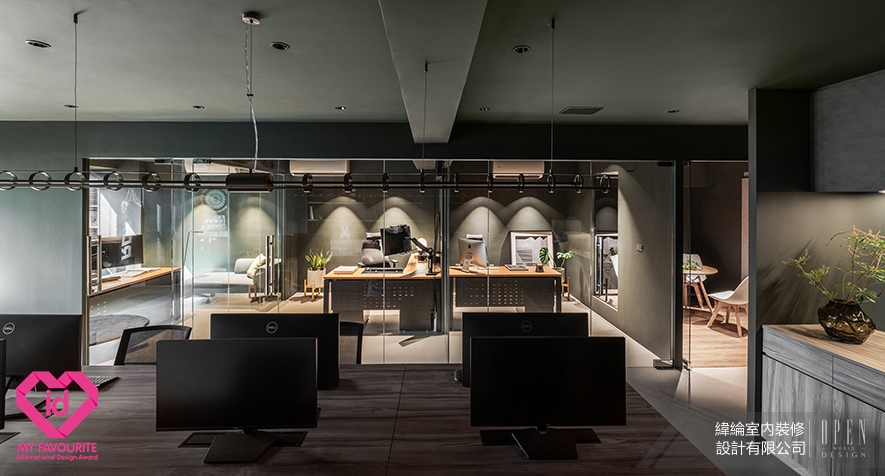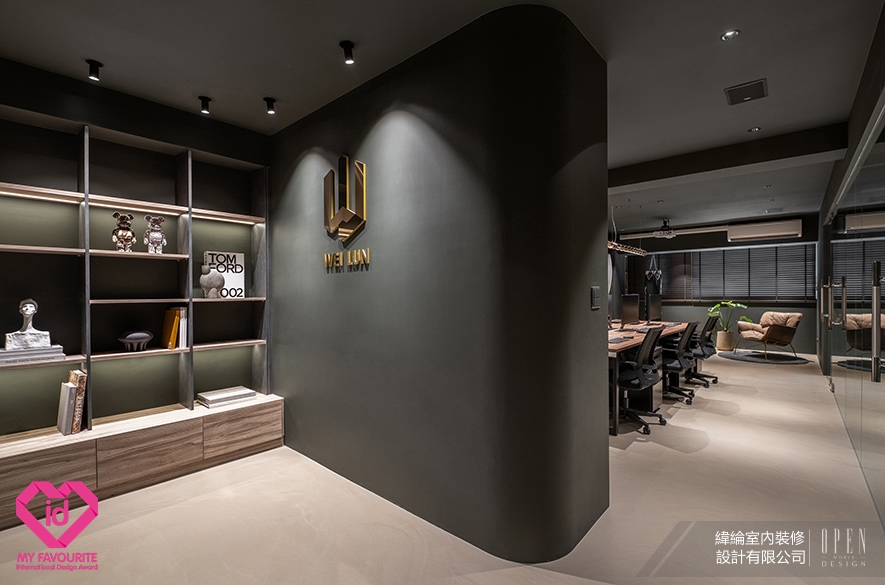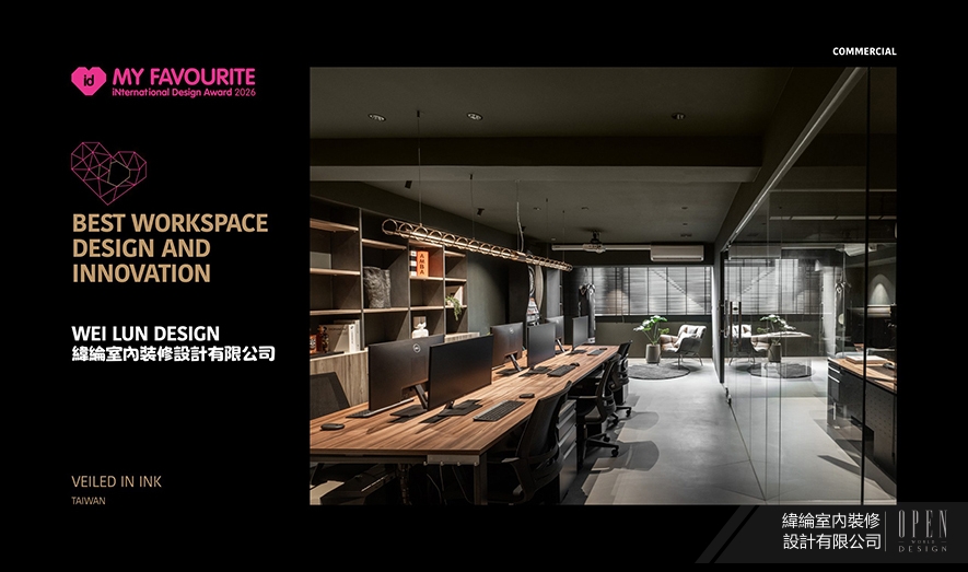 My Favourite International Design Award(MFID)作為馬來西亞首個且唯一的國際設計獎項,2026年由橫跨11國16位專業評審,以含括設計理念、美學表現力、功能性、永續實踐、文化脈絡等五大標準嚴格遴選,致力於發掘並推廣兼具精湛工藝與前瞻創意的優秀作品。為傳遞「設計即溝通」的品牌信念,緯綸設計 設計總監 華葦軒 於自身辦公空間《墨隱》中,以深沉墨色為基底,巧妙混搭溫潤木質與冷冽金屬,鋪展內斂而有光的沉穩氛圍;格局上採前、中、後三段式佈局,搭配玻璃隔間導引日光深入室內,兼顧通透視野與動線秩序,打造專注與對話並行的理想工作場域,精準呼應賽事對「設計創新與空間機能整合」的評選標準,成功摘下2026 MFID Awards商業類別「Winner」榮耀!