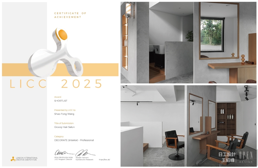全球指標性設計大獎London International Creative Competition(英國倫敦國際創意大賽,簡稱LICC),於2006年開展至今,每年皆向多國設計好手發出邀請,藉由評選出當中佼佼之作,引領建築、繪畫、影像等11大創作領域齊步向前!日工設計 設計總監 王紹峰 以兩件風格鮮明的商空作品角逐本屆賽事,其中《Groovy Hair Salon》將灰階藝術塗料和溫潤木質揉合於挑高雙層結構,墨綠磁磚櫃臺藉由色彩為動線指引,簡約卻富韻致的沙龍場域兼顧開放明亮及私密舒適,獲選「Shortlist」殊榮;另外《Twilight 餐酒館》則取暮光意象為靈魂,採用奶茶色霧面塗料與手工鑿刻壁面,配合低色溫暖光層次鋪陳,將減法設計推向極致,構築出日夜交界般令人微醺放鬆的沉浸式用餐場景,榮獲「Finalist」亮眼肯定!