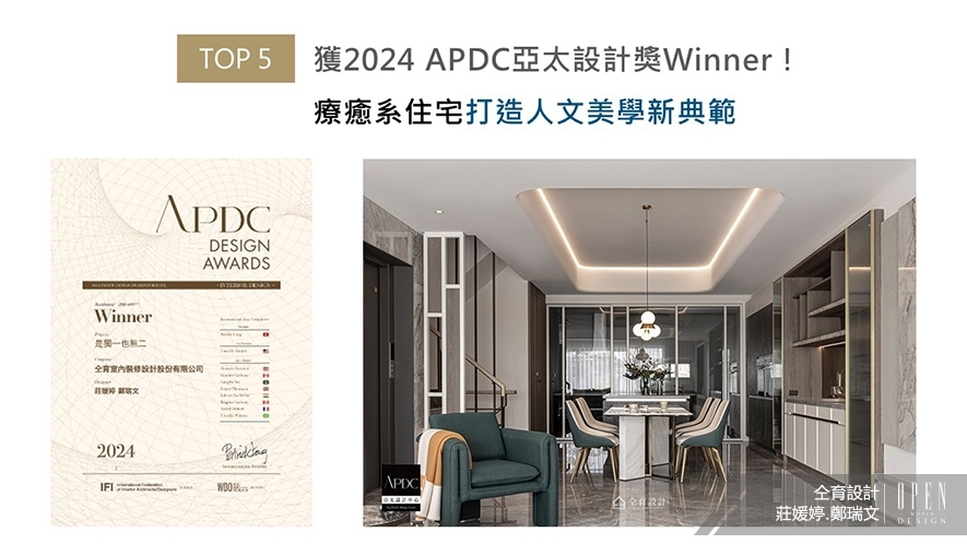 APDC亞太設計中心發起的APDC AWARDS,自2010年起每年舉行一次,是亞太地區最重要的設計重要指標之一。周圍環繞來自全球的優秀建築、室內設計師,仝育設計經源自東方哲學意象的核心發想,讓抽象的「天圓地方」概念,化作透天宅《是獨一也無二》中剛柔並濟的線條語匯,而水墨畫般的石材裝飾、壁面圓月造型、精心布置的植栽盆景,更帶來驚艷評審團的療愈山水藝韻,順利摘獲「Winner」獎項!