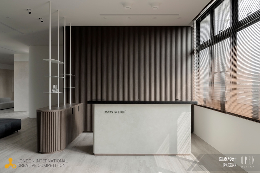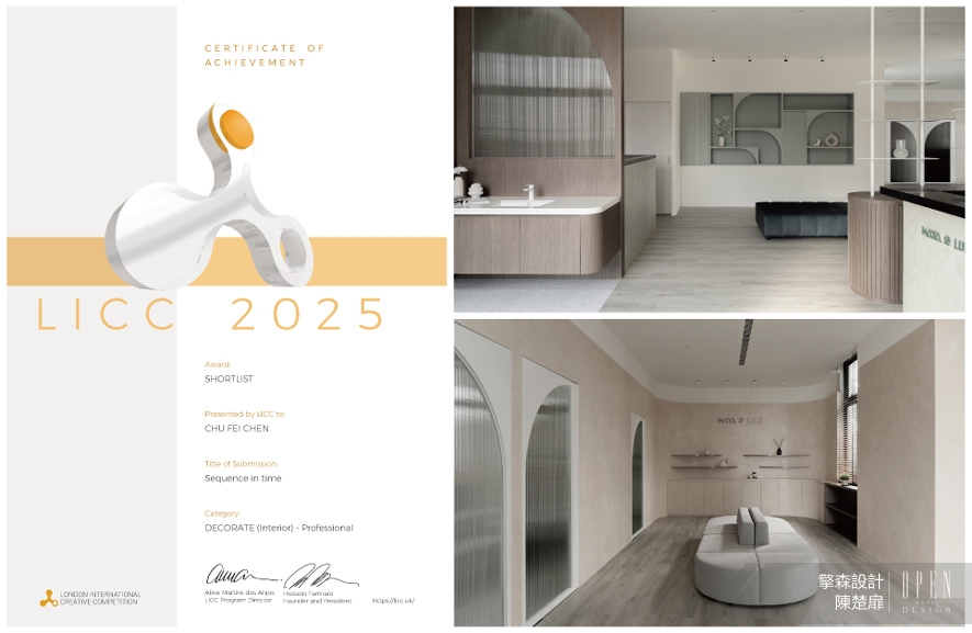 擎森設計 設計總監 陳楚扉 此次以母嬰攝影品牌空間《時序》參賽,從孕育生命的意象汲取靈感,以流動曲線串聯場域、大地色系鋪陳溫暖基調,並搭配特殊塗料和實木格柵等環保建材,在細膩的光影層次中,將母愛的包覆感轉譯為身歷其境的感官敘事。從入口延伸至洽談區,每處轉折皆以弧面柔化處理,引導來訪者安心遊走其間,卸下緊繃情緒,沉浸於靜謐而充滿生機的氛圍,作品理念與大賽核心精神高度契合,榮獲本屆「shortlist」殊榮!