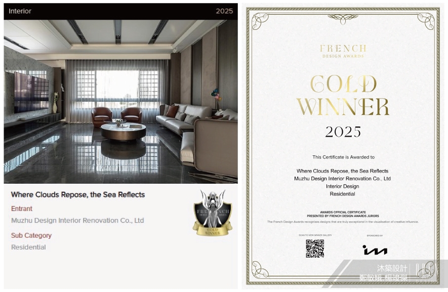 French Design Awards由歷史悠久的國際獎項協會International Awards Associates(IAA)主辦,旨在支持室內、建築、產品、包裝、時尚和景觀設計領域中,勇於創新、突破界限的非凡設計師,並透過表彰融匯創造力和美學功能、可持續性的雋永作品,鼓勵所有創作者為設計領域注入嶄新生命。沐築設計 設計總監 鄭敏娥、楊竣傑 於三代同堂度假宅《雲栖海映》中,以一樓玄關、二樓梯廳為中軸線,對稱劃分公私領域,清楚區隔主客動線,同時藉由開放式公區及全套房配置,回應屋主招待親友的社交需求;其中一樓多功能次臥搭載掀床、臥榻與隱藏式滑桌,既可供多人通鋪留宿,亦能作為窗畔品茗觀景的起居角落。美學鋪陳層面,玄關處金色蝴蝶端景隱喻家族凝聚和擴展,搭配滑門飛鳥芒草、床頭花卉浮雕與魚群洄游等自然語彙,引領戶外綠意悄然滲入屋內;長遠考量上,設計師揀選耐候金屬、低甲醛綠建材及無障礙地坪,結合一、二樓雙主臥規劃,妥善構築屋主退休後安全無毒、行動無礙的宜居場景。細膩呼應使用者情感與實用所需的雋永之作,高度契合賽事對「創意、功能性與長遠影響」的評選要求,獲得本屆French Design Awards「金獎」肯定,使品牌魅力綻放世界光彩!