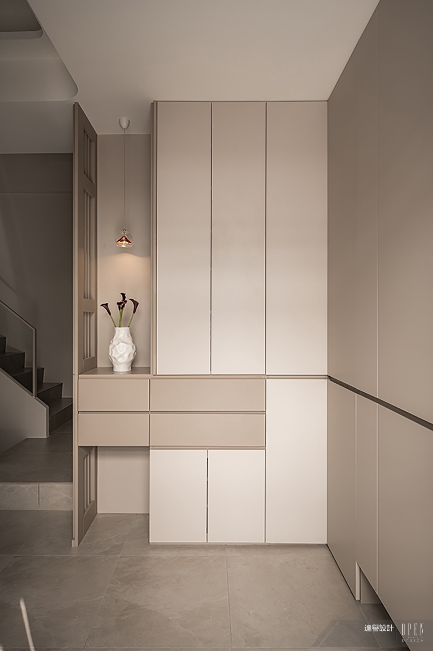 玻璃磚的透、弧牆的收、百葉的濾,在 達譽設計團隊 的細膩鋪排下,各自承接起採光、動線與收納的空間主軸。每處選材都甘於退讓,安靜融入起居的背景;當設計不再被刻意凝視,空間本身便化為最真摯的暖語,為親愛的歸人,砌一座簡練換取安心、用餘裕承載生活的棲居之所。