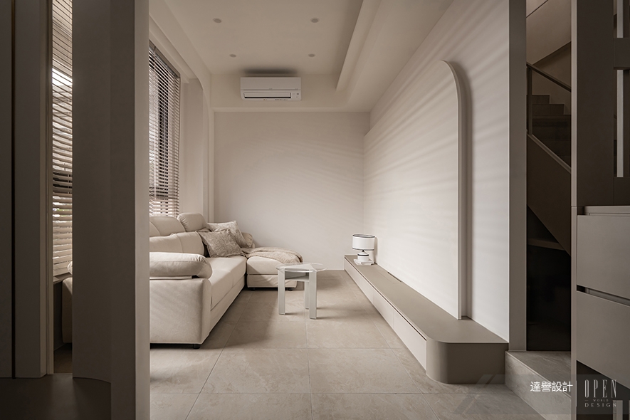 推開門扉,整面暖灰櫃體藉由俐落線條安靜佇立,轉身步入客廳,輕淺色調的白隨即舒展開來,牆面循著一道柔緩曲線化解直角生硬,一旁淺色格柵隔屏輕盈地界定廊道進退,在連貫中悄悄梳理動線鬆緊。靠窗一隅,奶油色沙發被窗外引入的日照輕擁,透明茶几映著窗外樹影,前方電視櫃沿弧牆水平鋪展,機能退居幕後,留出大片空白任光影自在描畫,拼寫安靜卻有溫度的每一天。