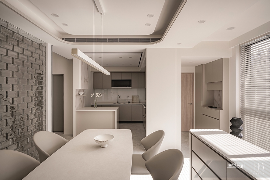 繞過樓梯來到餐廳,這道玻璃磚牆便成用餐場域最具表情的背景——磚面折射的粼粼光澤,為素淨空間注入細緻的肌理變化。天花採層疊弧線柔化結構存在,一盞纖長的線性吊燈垂懸而下,精準地為淺色石面餐桌標定出聚攏的中心;一側 L 型廚房順勢延展,藉由半高中島吧臺銜接餐區,讓炊食、餐敘與客廳的光線在同一條動線上自然流動。午後暖光順著窗沿漫入桌面,鋪開一層細密明暗韻律,共同編織出恬淡明朗的餐敘時光。