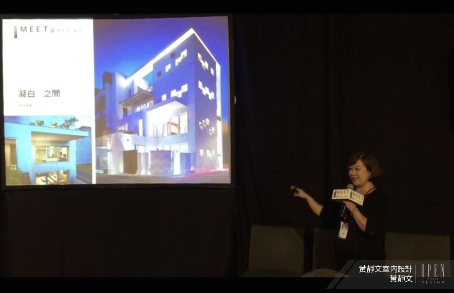 在分享會中,總監以自己的得意之作《凝白之間》為主軸開展,提及當初業主願意把打造他們「未來的家」這個重責大任全權交給自己,讓她相當感動。而思考出發點受到建築大師Richard Meier影響,將幾何與白色元素應用到設計中,從建築外觀、結構到開窗細節與室內設計都一手包辦,在在均考驗總監的功力,不僅讓路過這棟建築的人印象深刻,也讓總監能夠淋漓盡致揮灑創意,原來設計也可以變成一件雕塑品。