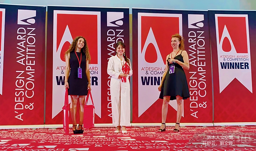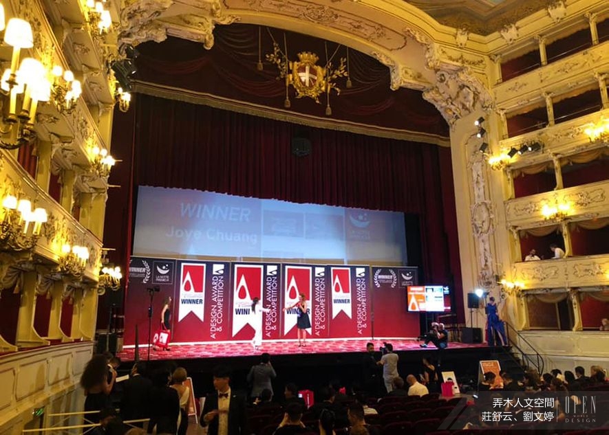 (圖)弄木團隊以商空作品《奉食主義》,奪得2019義大利A’ Design Award「銅獎」名次,由Celine代表上台受頒獎盃,並於第一時間與業主同享榮耀!