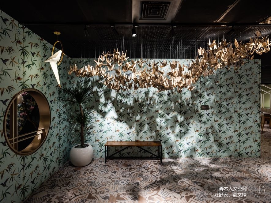 (圖)弄木人文空間 商空作品《金鶴真好》,端景牆裝設全由團隊親手進行,逐隻綁線吊掛後,再進行高度及位置微調,為入門賓客獻上百鶴飛舞的驚奇光景。