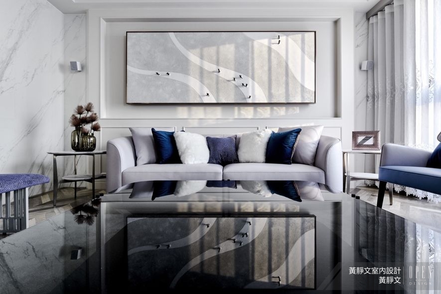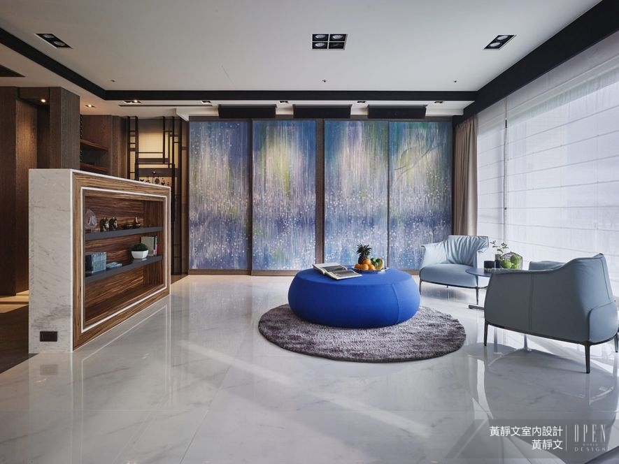 而在大氣兼容的家宅作品《韜光隱山水》中,開門即見陳老師創作的貴氣端景——格柵般輕巧篩入藍白光線的鐵件立面,與沉穩時尚交織東方古意的公領域相應,疊合表徵中式風味的「格柵」線條,和高貴典雅的藍白色板,構成和諧而寧靜的視覺效果;其向下投射於大理石地坪的倒影,以及側向映照於水滴型鏡體的反射,亦在在叩合東方的「虛實」概念。能夠含有如此多重趣味的表現,是源於設計師與工藝家雙方對空間材質、角度的仔細討論考量,使得觀者只需細觀一隅,便能掌握到充沛其間的量體精神!