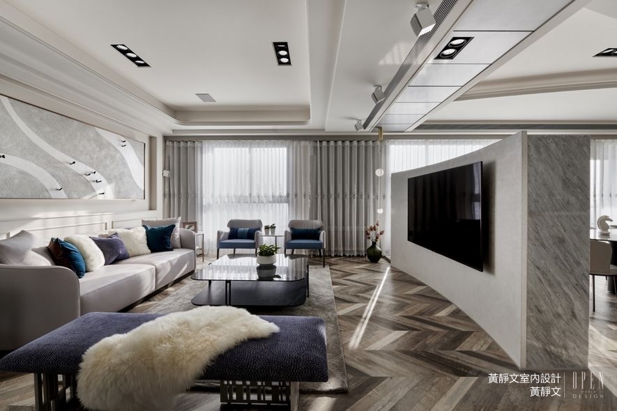 首先出場的是彩繪藝術家陳玟靜,她在作品《人間漫旅》中,捕捉了設計師強烈的創作意念,將「即便我們只是宇宙旅程中的短暫過客,仍想在這有情人世留下美好印記」的抽象主題,透過雕塑畫形式化為真實。畫作在色彩選擇上,採用粉灰與白色系回應場域色調,再搭配柔軟的弧形線條,既隱喻人行於世的各種路途,同時與公領域中,設計師大量使用的曲型語彙,如弧形電視牆,產生緊密對話,不僅強力顯現出空間意旨,更以最直接的方式,讓觀者看見生活的柔軟美好。