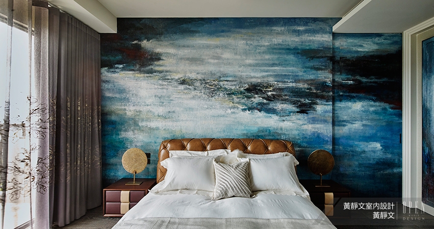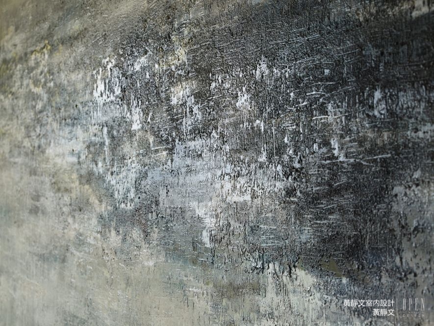 而在作品《盤根》中,藝術家再度以創作理念為基準,將「有如走進森林般恬靜」的生活體驗延伸入畫,在場域低調奢華的主題下,巧妙融入藝術元素。在整體色調偏灰的公領域,與時尚軟件相對的是名為「雨落森林」的繪畫四連作,凝結霪雨紛飛的夢幻瞬間,化作柔美沉靜的藍紫色彩,與灰調場景及溫暖的落地窗光共構靜謐的圖像語言,引人走近感受其粗礪的塗刷痕跡,或許一個回身,才發現已深陷雨露間的光影遊戲。至於私領域則展開尺幅更為壯闊的山嵐畫卷,具體描繪出靄靄雲霧,與充溢人文情懷的量體同呼一氣,更為睡眠場所注入穩定心靈的遼闊力量,使場域核心潛移於「美」。
