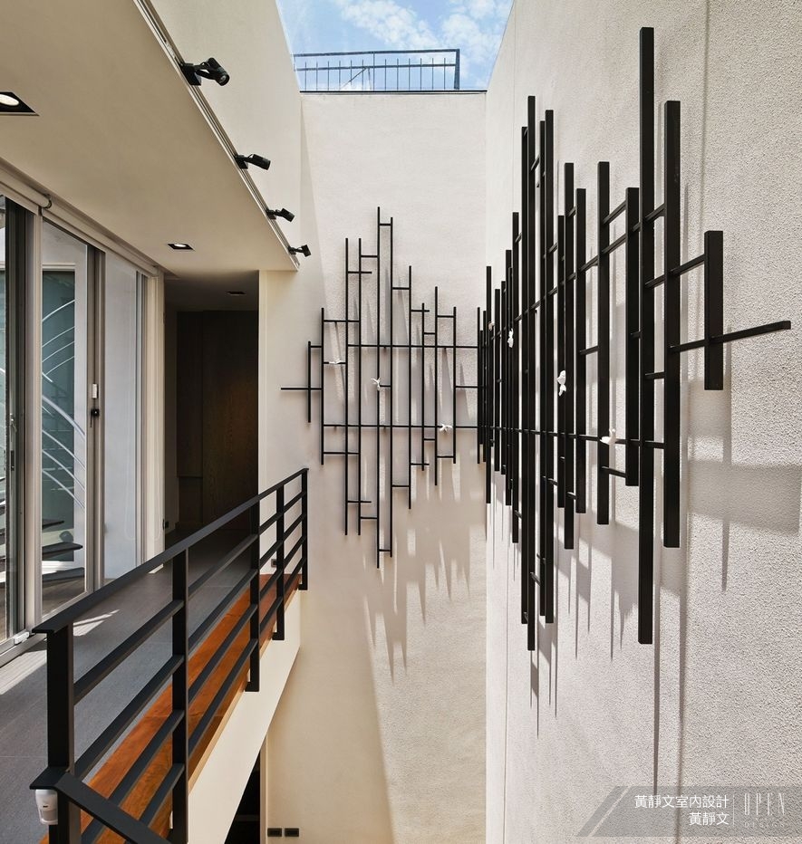 接著介紹的是鐵工藝匠陳三奇,在屢獲國際設計賽事肯定的作品《凝白之間》中,陳老師借建築基地的採光優勢,於日照角度豐富的天井立面,以綿延兩牆的大型黑色鐵件藝品,展現結構感強烈的線面變化,呼應宛如陶藝雕塑的純白建築外觀,而點綴其上的小金魚雕塑,亦為剛硬不苟的理性線條增添玩趣。隨著井邊流入的日影增減,藝品為高聳的白牆勾勒最真實的時光痕跡,了無痕地將自然元素導引為景,使人觀景同時,深切感受到創作者駕馭巨型尺幅的功力,以及縝密考量環境條件的美感心思。
