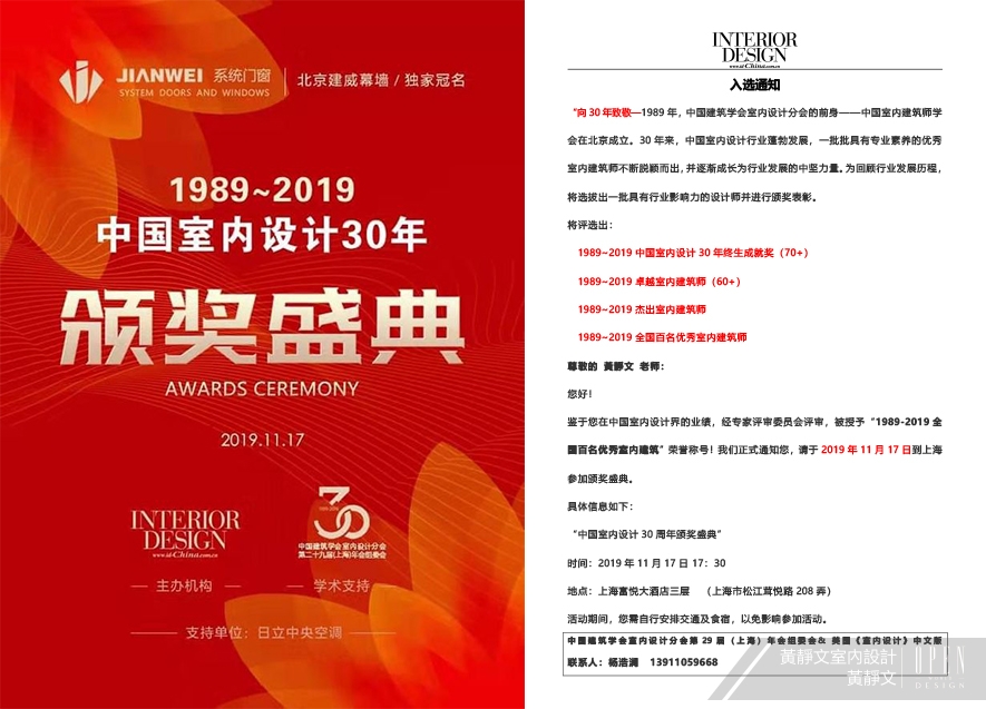 由美國《室內設計》中文版、美國室內設計中文網及CIID中國建築學會室內設計分會於2005年發起的「中國室內設計年度封面人物」,至今迎來第15個年頭,且適逢CIID成立30週年,為回顧行業發展歷程,亦藉此雙喜臨門之際,於11月17日在上海,共同舉行隆重頒獎盛典!