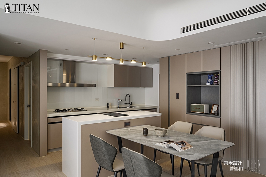 棠禾設計 曾智和 設計總監 於公領域天壁及多處轉角匯入曲弧元素,攜手立面洗鍊的線條造型,呈遞優雅而俐落的時髦風韻,其間選配暖色調和木紋的家具、櫃體,成就溫潤和暖的家宅作品《潤晴》,榮獲2024 TITAN Property Awards銀獎佳績!