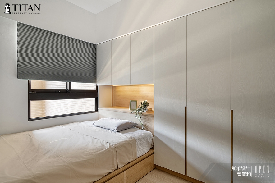 ▲小孩房以木白色調結合素色天花板,勾勒整潔的樸素畫面,賦予住者輕盈無壓氛圍,並於床背牆規劃整面壁櫃,輔以床下地台抽屜、床頭掀櫃設計,構築收納充裕的舒適空間。