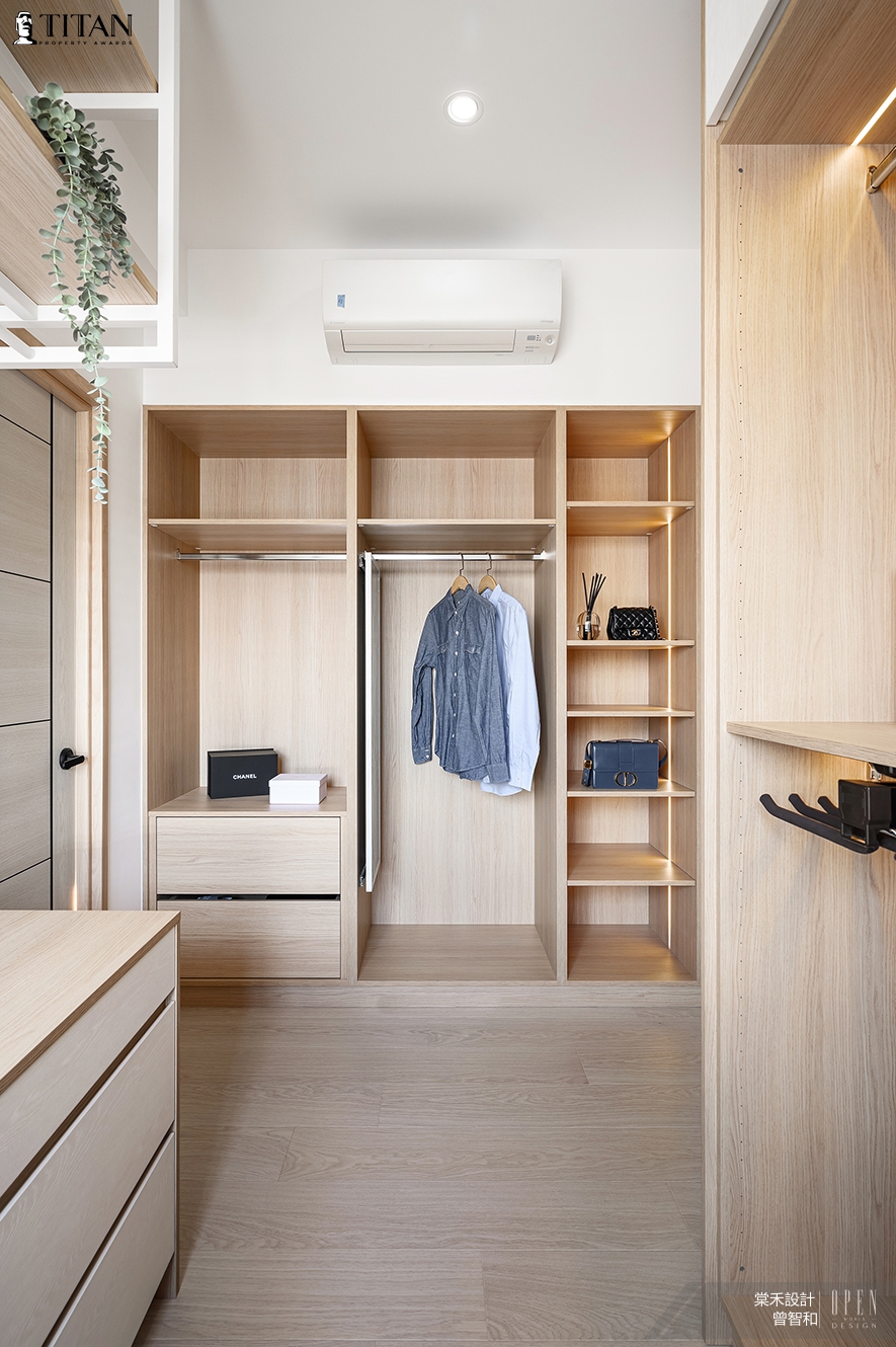 ▲主臥更衣間以木質為基調,綴搭留白牆面和純白鐵件,彰顯大量木紋的柔潤暖意,內部置入開放式衣櫃及收納層架,提升業主拿取、整理衣物的效率。