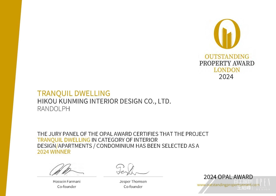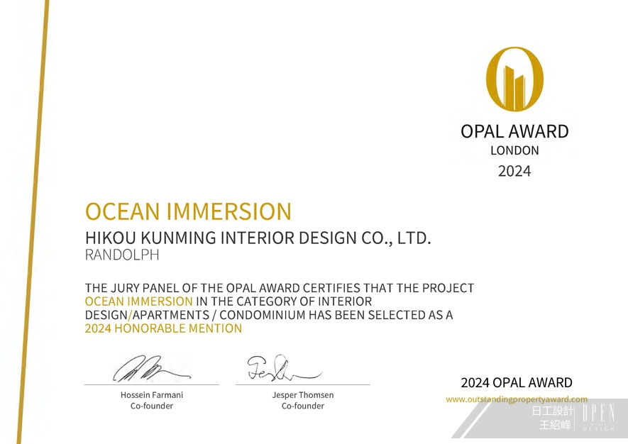 OUTSTANDING PROPERTY AWARD LONDON,OPAL(英國倫敦傑出地產大獎)由全球知名企業集團Farmani Group組織,並以招攬全球最佳建築師、室內設計師與房地產開發商為目標,在創造異業菁英聯合平台的同時,找尋各地最富創造力、革新感、社會影響力與永續性的設計方案。參與者有機會替自己最新穎的企劃,博得國際能見度,並且和產業的先驅及專業人士進行交流。日工設計 設計總監 王紹峰 透過石材紋理、金屬元素與深色木質等材質,平衡男女主人對奢華與簡約的不同偏好,營造沉靜雅致的居家情調《頤居》,斬獲賽事「Winner」榮譽;此外,以深藍色為基底,搭配純白與木調,營造寬廣而沉穩的家居氛圍,並運用鮮明的綠、黃、黑等色彩點綴各個房間,賦予空間鮮明個性的作品《沐海》成功榮獲「Honorable Mention」殊榮,兩大優秀作品使品牌聲望再創新高!