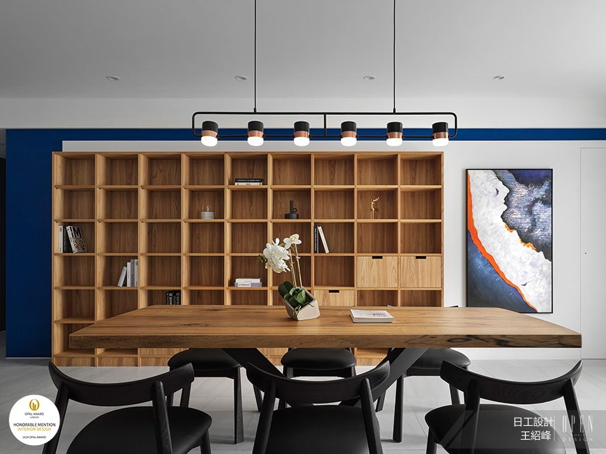 ▲餐廳選用厚實的實木餐桌,延伸後方大型書櫃的木質紋理,餐椅則配合一家人在此閱讀的情境,選擇優雅的黑色圓弧造型,上方搭配一排同色系的吊燈,牆上的畫作融合了空間中的藍、白主調,另以些許鮮橘做跳色變化。
