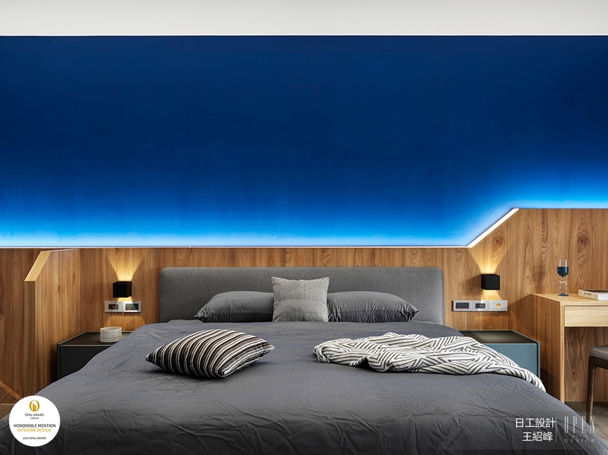 ▲主臥延續公領域的深藍、純白搭配與灰色軟裝組合,並基於舒適性考量,使用實木打造具備立體感的階梯式床頭牆,且於鄰近出入口處設置遮擋板,避免影響睡眠。