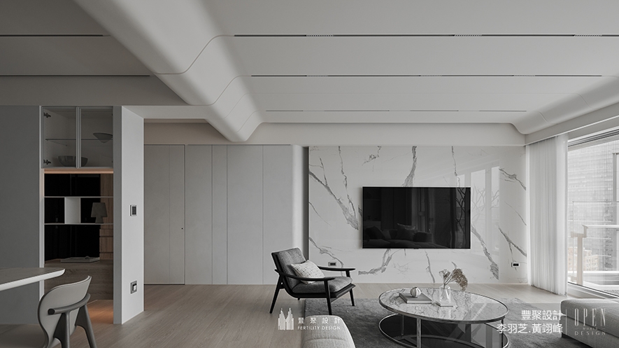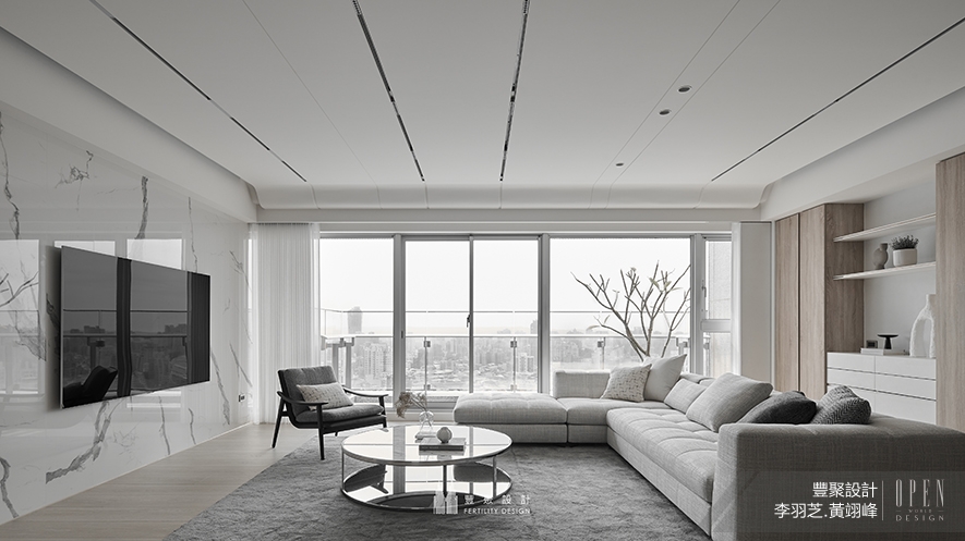 透過大片落地窗,城市的景色如同一幅緩緩展開的畫卷,將所有美好框入視野之中。L型淺灰沙發上靜臥同色系的柔軟抱枕,承接著午後微光的溫柔,形構身心放鬆的悠閒角落。圓形茶几映出窗外光影的律動,為空間帶來動感與層次感,隨著時間流轉,產生多變耐賞的趣味美景。大理石牆面沐浴在潔白的光線之中,呈現出清透、純粹的美感,於此處灌注一種冷靜與沉穩的氛圍。整體設計以開闊布局與細膩材質,勾勒居者追求的平和寧靜與高品質生活體驗。