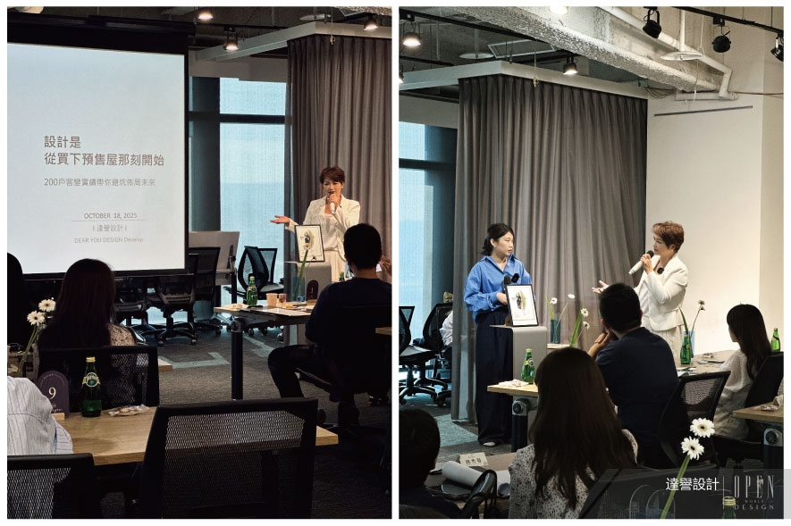 活動當天,兩位總監籌備多個演講主題:「從圖面走進家的樣子──如何讓預售屋『設計到位』」、「平面圖診療室」、「預售宅客變:常見問題與風險避雷」。從最基本的客變規則限制、變更時間起始,到指引現場聽者找出自身生活所需的關鍵,乃至格局、水電、擴充性等常見問題與規避風險的最佳方法,鉅細靡遺地解說預售宅客變的重要性;甚至邀請實際入住客變屋的客戶到會場,使與會者不僅從設計師的專業角度獲取預售屋客變的豐富資訊,更能由親自體驗過客變差異的屋主口中聆聽最真實的回饋,多元觀點與面向的充實講座,讓所有來賓收穫豐碩。