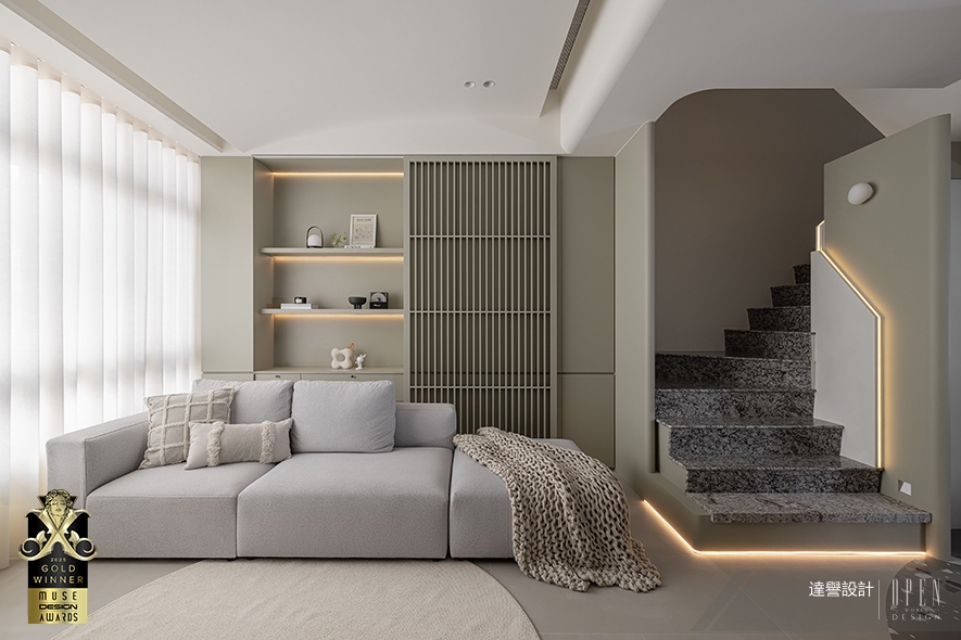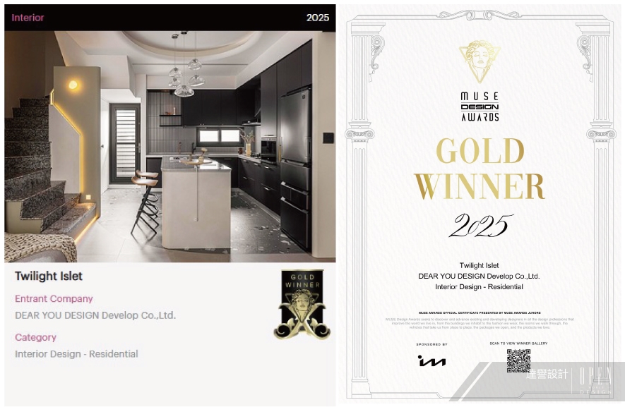 美國MUSE Design Awards致力於發掘全球設計謬思,涵蓋建築、室內、時尚等領域。2025年下半季共吸引來自124個國家、超過10萬件作品參賽,由200多位專業評審嚴格遴選,可謂最具影響力的國際獎項之一。達譽設計團隊 堅守「以人為本、環境友善」的創作初心,從細微的牆面熱感應燈為長輩與幼童點亮安全路徑,到隱藏式收納最大化家庭的開闊感受;從精選低甲醛環保建材守護居住安全,到運用LED與自然光源,打造節能健康宅《暮光微嶼》,每一處設計決策皆高度契合大賽「發掘兼具創新精神與人文關懷的設計」宗旨,喜獲2025 MUSE Design Awards的金獎佳績!