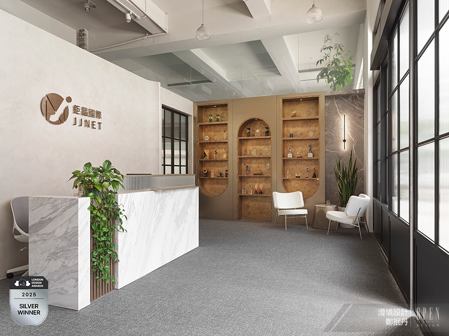 澄境設計 設計總監 鄭抿丹 深入聆聽業主需求、細膩洞察企業文化,靈活運用大地色系的柔潤暖意,融匯多處置入的植栽及繽紛跳色家具,讓科技公司的冷冽印象,盡數轉為天然元素的親和活潑感,辦公空間《淨光敘簡》道出公司對自然及科技和諧共榮的未來憧憬,受到評審團一致讚許,抱回本屆賽事「銀獎」殊榮!關於LONDON Design Awards