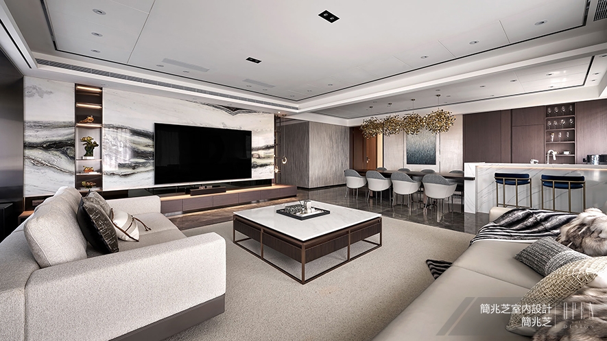 ▲客廳牆面以淺色為主,佐搭大面積落地窗,打造開闊明亮空間感,電視牆深色陳列櫃前垂墜半弧月形吊燈,圓潤線條與整體風格相協調,中央擺放深色底部、白色桌面茶几,周圍環繞灰白雙色沙發,色調平衡,體現設計的一致性。