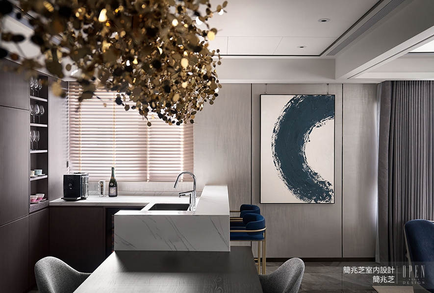 ▲餐廚區餐桌連結白色石紋吧台,提供輕食準備兼休閒的理想場所。一幅藍灰漸層的抽象畫作與另一側的圓弧水墨畫,為該區注入藝術氣息,同時再次呼應上空四顆吊燈,強調「圓滿」之意。