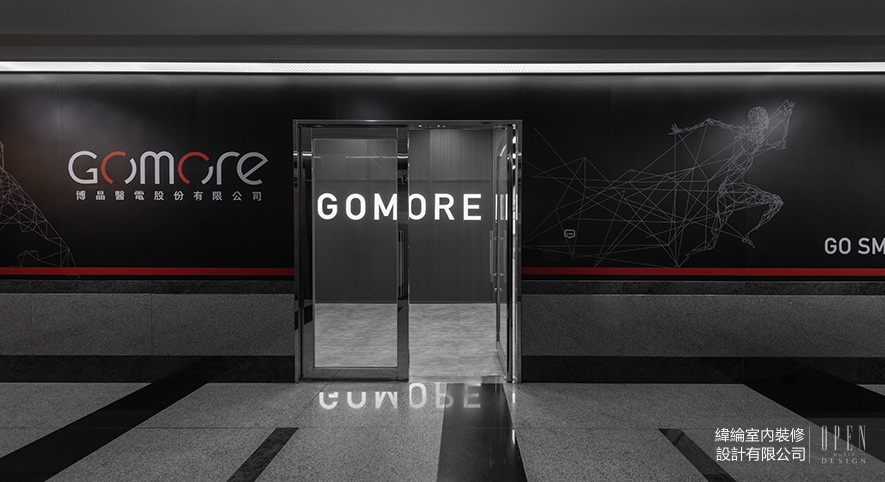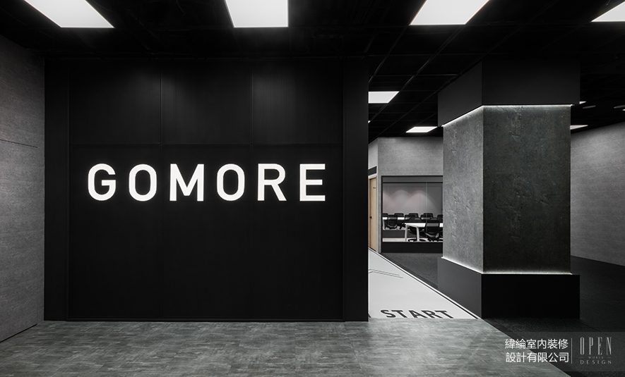 推開玻璃門扉,「GOMORE」品牌標識以簡潔有力的白色字體嵌入深色背景,在沖孔板的規律紋理襯托下格外醒目,傳達出強烈的品牌辨識度與專業形象。空間的引導系統貫穿上下層次——主通道地面標示著「START」字樣,為每次踏入創造儀式感的同時,對應企業致力於運動科學新起點的核心理念;上方LED燈具呈序列分布與之呼應,雙重動線系統共同營造強烈透視感,引導視線向前延伸,塑造富有科技感的未來主義氛圍。