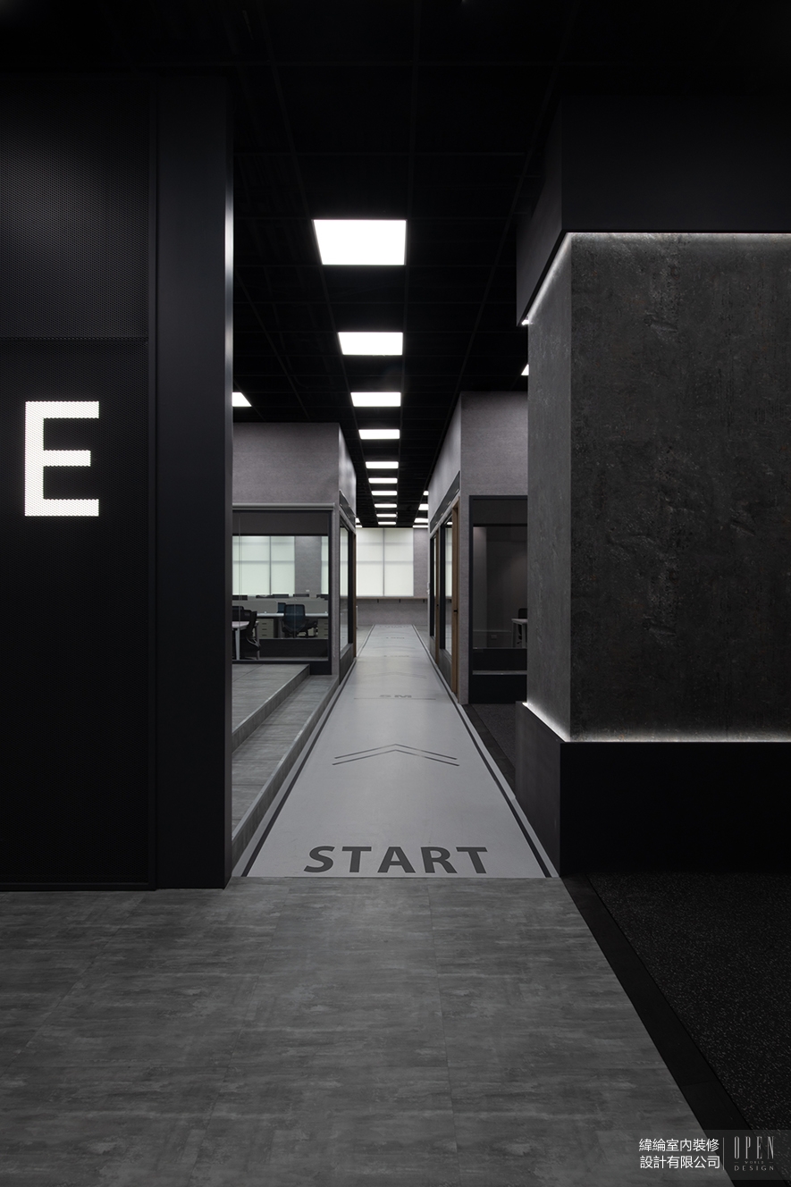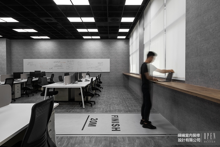 開放式工作區以深灰色牆面與地坪鋪陳沉穩基調,潔淨白色桌面搭配黑色座椅構成經典對比配置,在灰調背景中呈現俐落有序的視覺感受,奠定專注而安定的工作氛圍。因應多樣化工作情境需求,設計整合豐富協作機能:牆面大型白板成為團隊交流的核心載體,臨窗的木質檯面則提供站立討論的便利平台。地面「FINISH」標識與入口「START」遙相呼應,透過簡潔的符號定義空間的起訖,強化動線的明確性,也為嚴謹的工作環境增添一絲輕鬆的設計巧思。